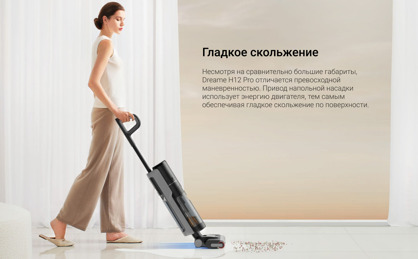 Легкий вес и удобная конструкция делают уборку удобной и простой.  Руки не устанет даже после генеральной уборки: эргономичная рукоятка H12 Pro расположена на оптимальной высоте — дизайн, продуманный до мелочей.