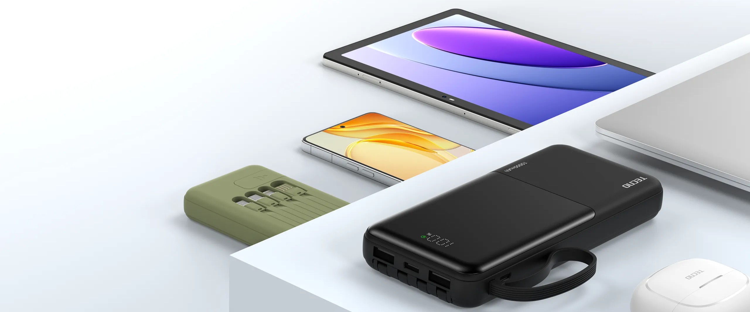 Tecno L101Q выполнен в лаконичном корпусе из прочного пластика. Устройство компактное — 14.6×6.75×2 см — и весит всего 236 граммов, поэтому легко помещается в сумку или карман рюкзака. Корпус не имеет рисунка и выглядит универсально, а встроенная подставка для смартфона делает использование пауэрбанка удобным в дороге или на рабочем столе.