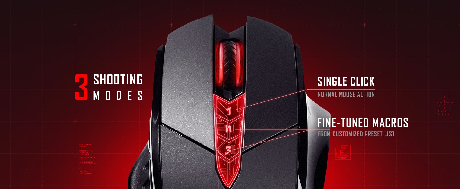 В конструкции мышки присутствуют 8 механических кнопок, среди которых клавиши, запрограммированные на мгновенный доступ к игровым функциям, дополнительные кнопки, обеспечивающие быструю смену режимов стрельбы во время игры, и колесо прокрутки. Все они обеспечивают оперативную реакцию мыши на действия пользователя.