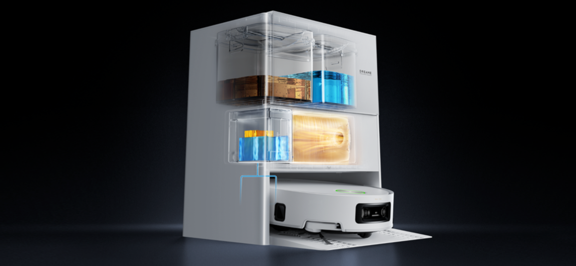 Станция полностью берёт на себя обслуживание робота. Она опустошает встроенный пылесборник объемом 0.22 л в большой контейнер станции на 2.5 л, подаёт чистую воду из резервуара на 4 л и возвращает робота к уборке после зарядки. Такой подход значительно снижает необходимость ручного ухода и делает модель почти автономной.