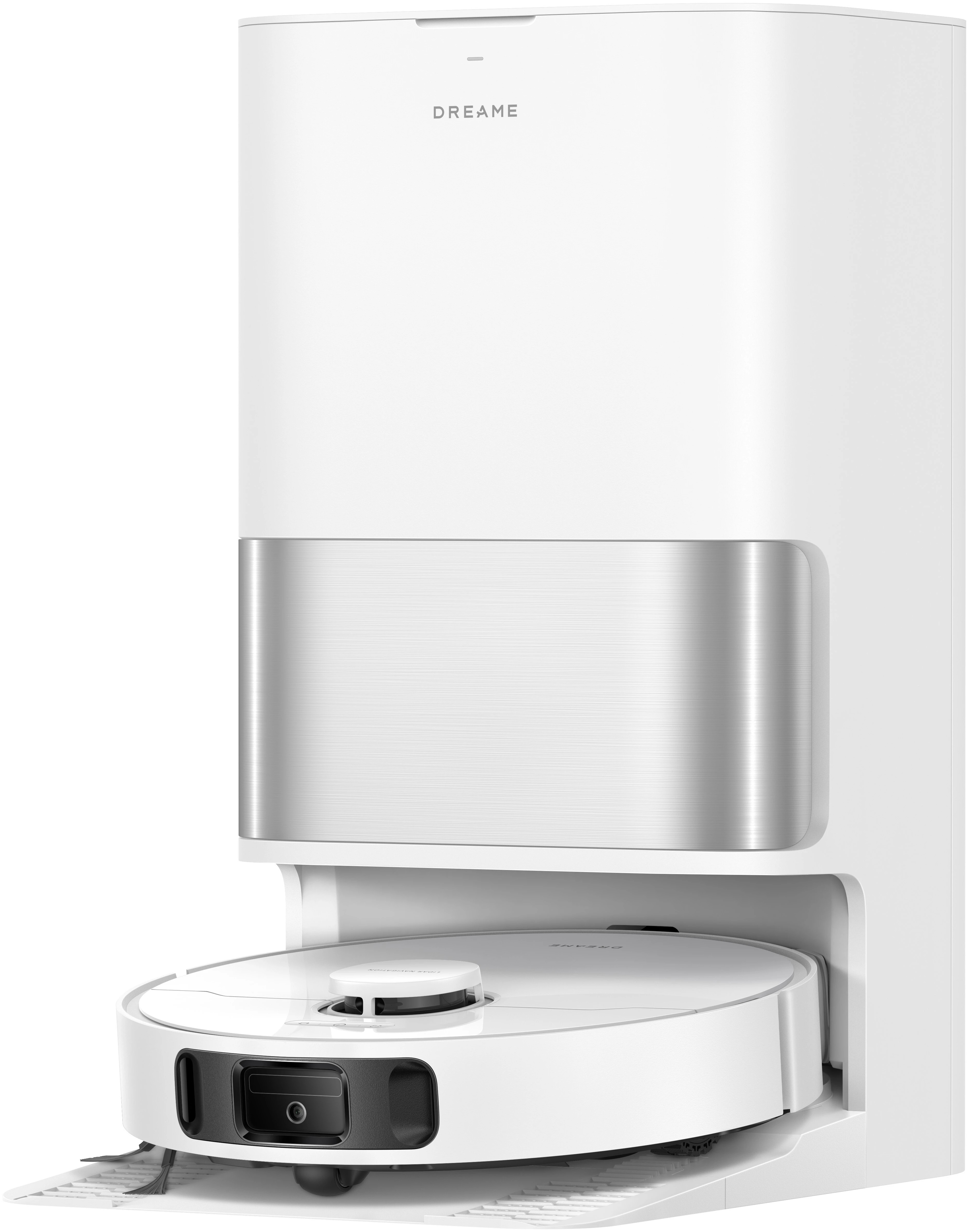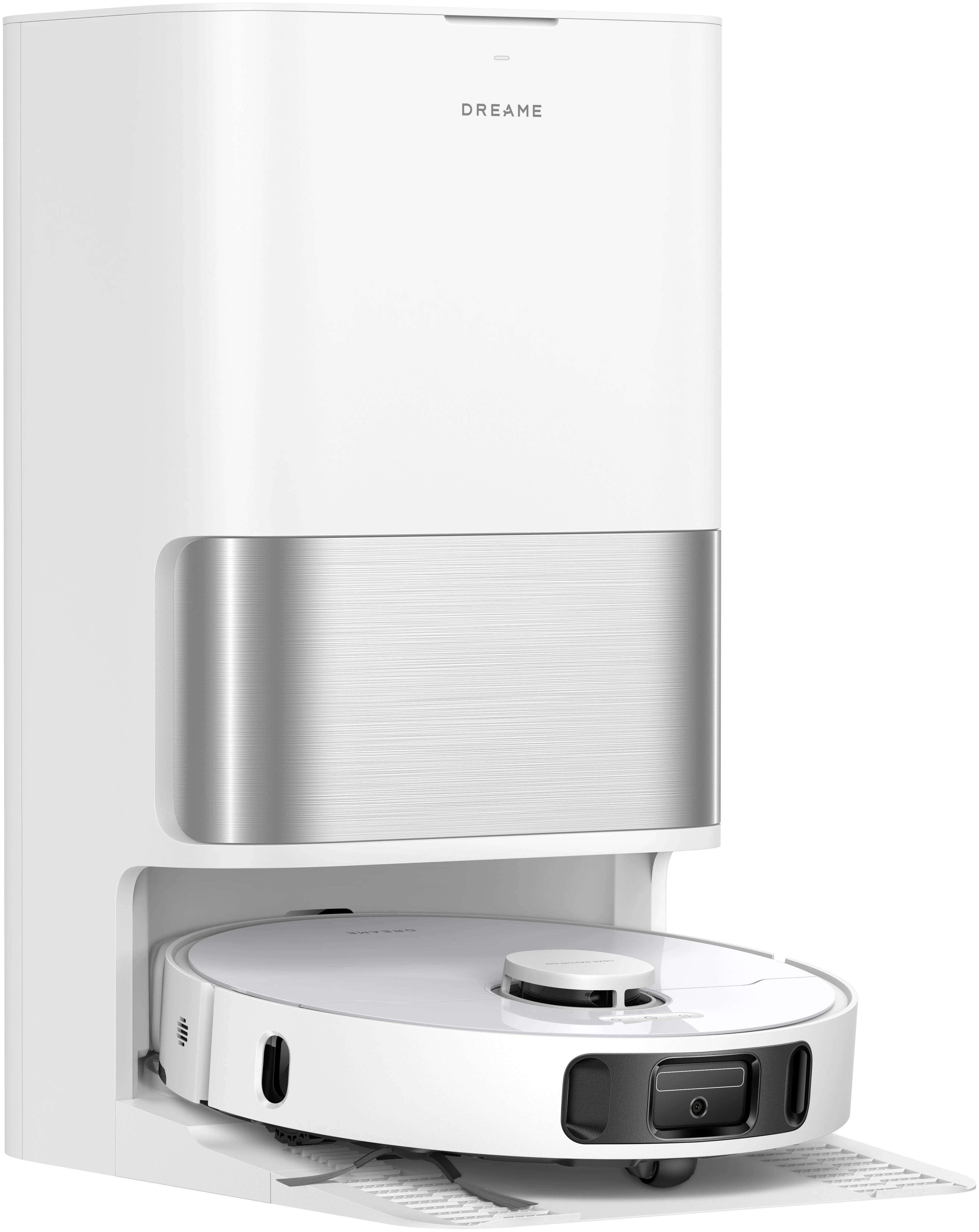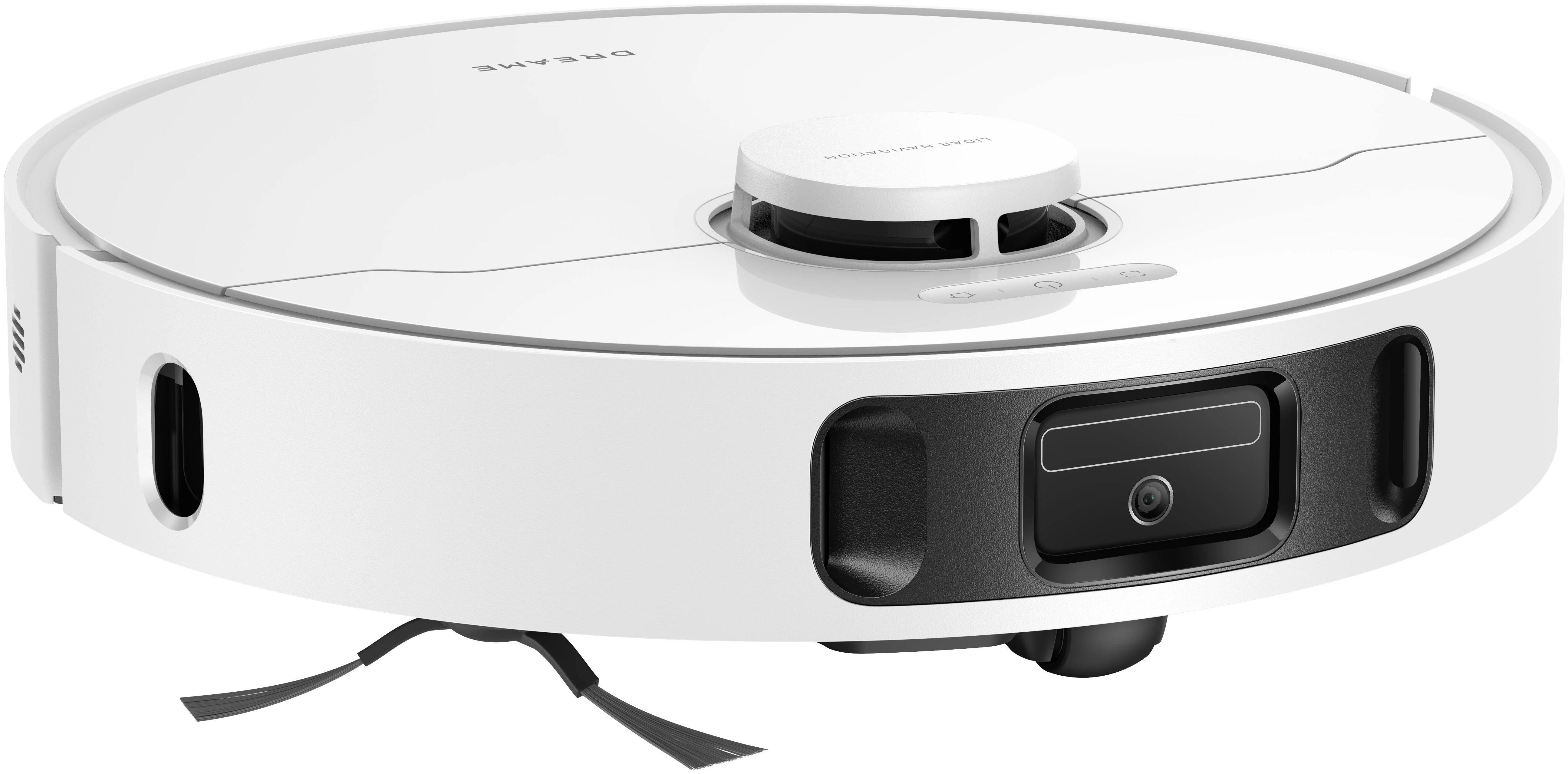 Dreame D30 Ultra выполнен в аккуратном корпусе белого цвета с серебристыми элементами. Высота 9,7 см позволяет роботу свободно заезжать под мебель и убирать труднодоступные зоны. Конструкция продумана для ежедневной эксплуатации, а боковые щётки улучшают сбор мусора вдоль стен и в углах.