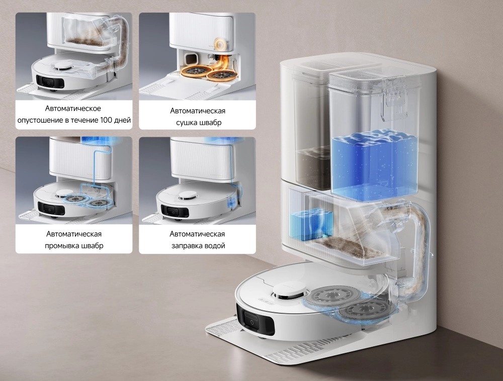 Станция самообслуживания превращает Dreame L40 Ultra CE в полностью автономное устройство. Она не просто очищает салфетки и опустошает пылесборник — она наполняет резервуар чистой водой, сушит тряпки горячим воздухом, автоматически дозирует моющее средство и сохраняет свежесть швабр. Всё это позволяет использовать робот без участия владельца до 75–100 дней подряд. Даже промывка происходит при помощи тёплой воды — для лучшего удаления грязи и микробов.