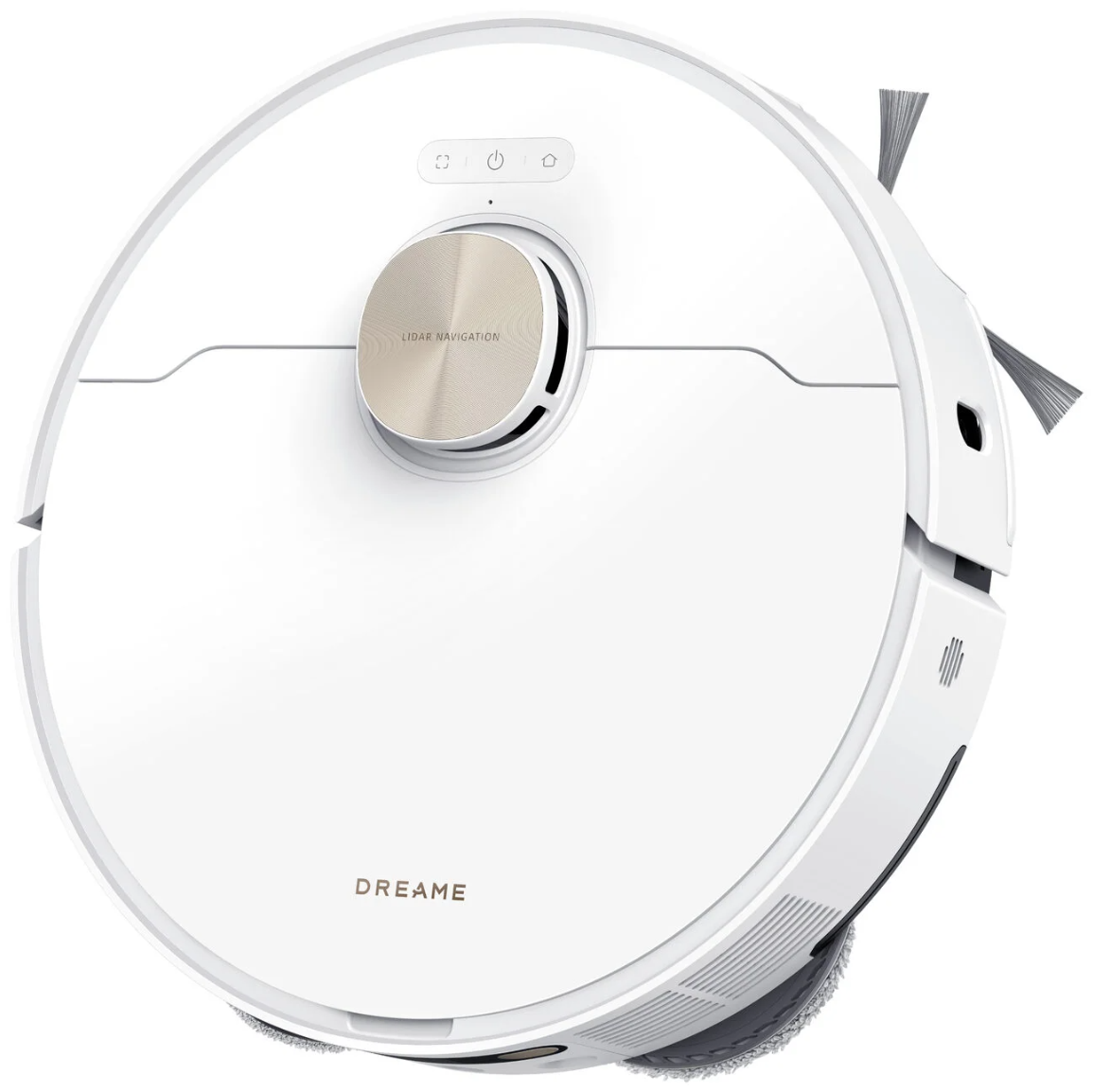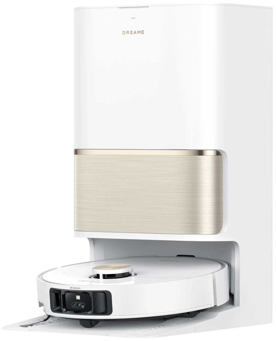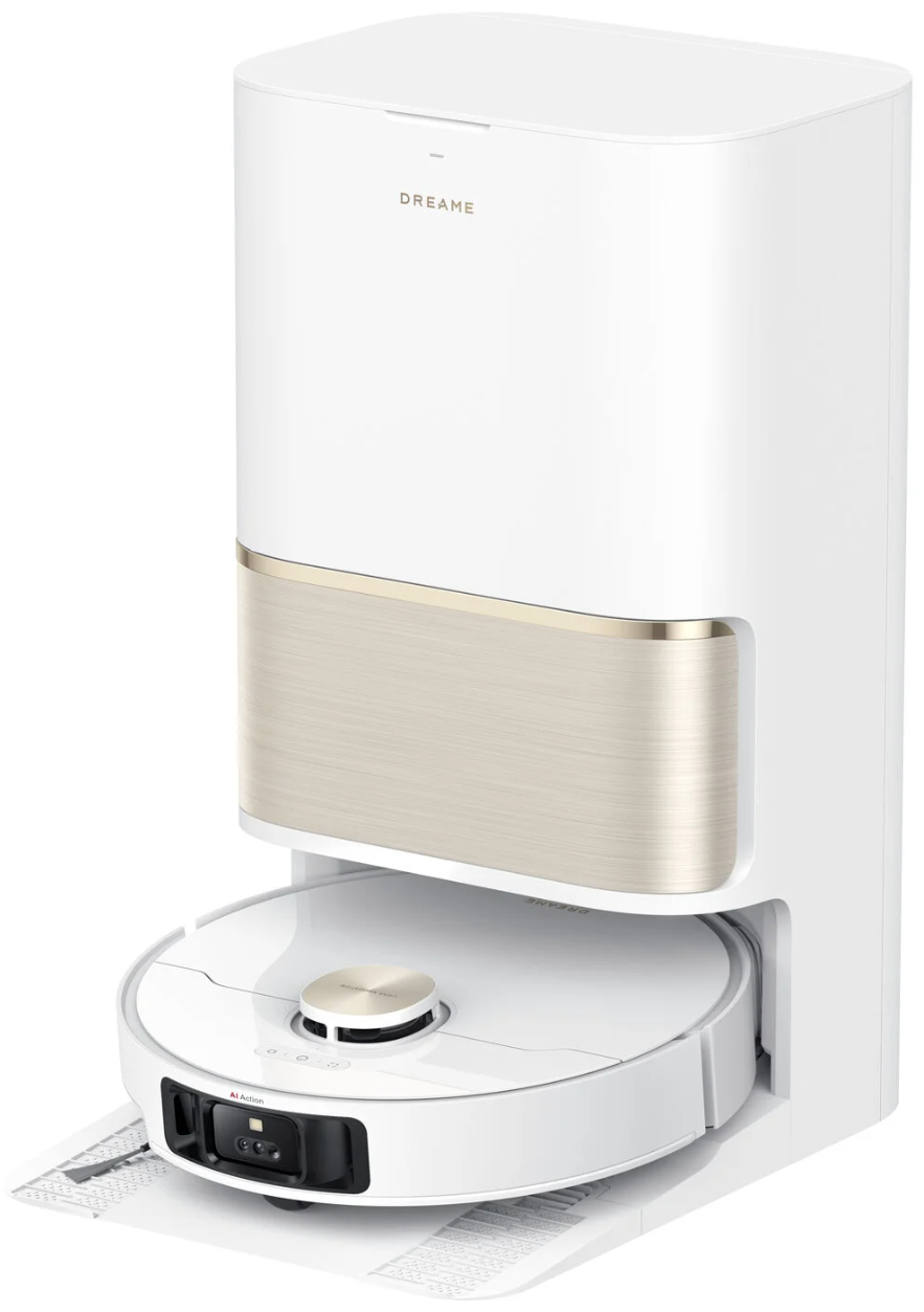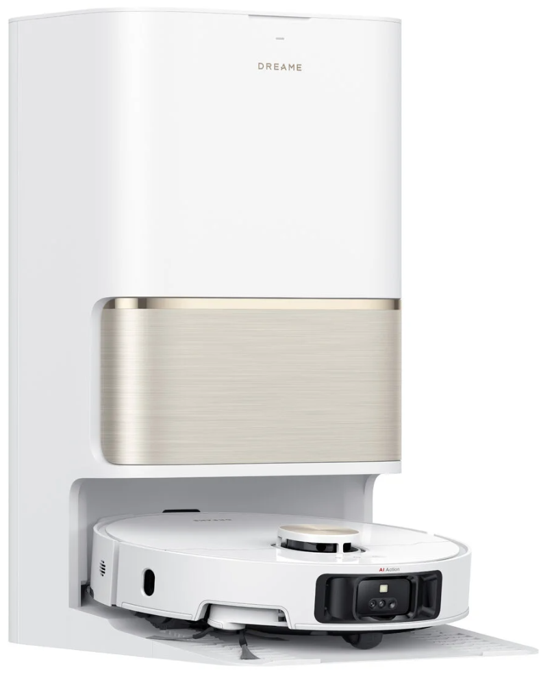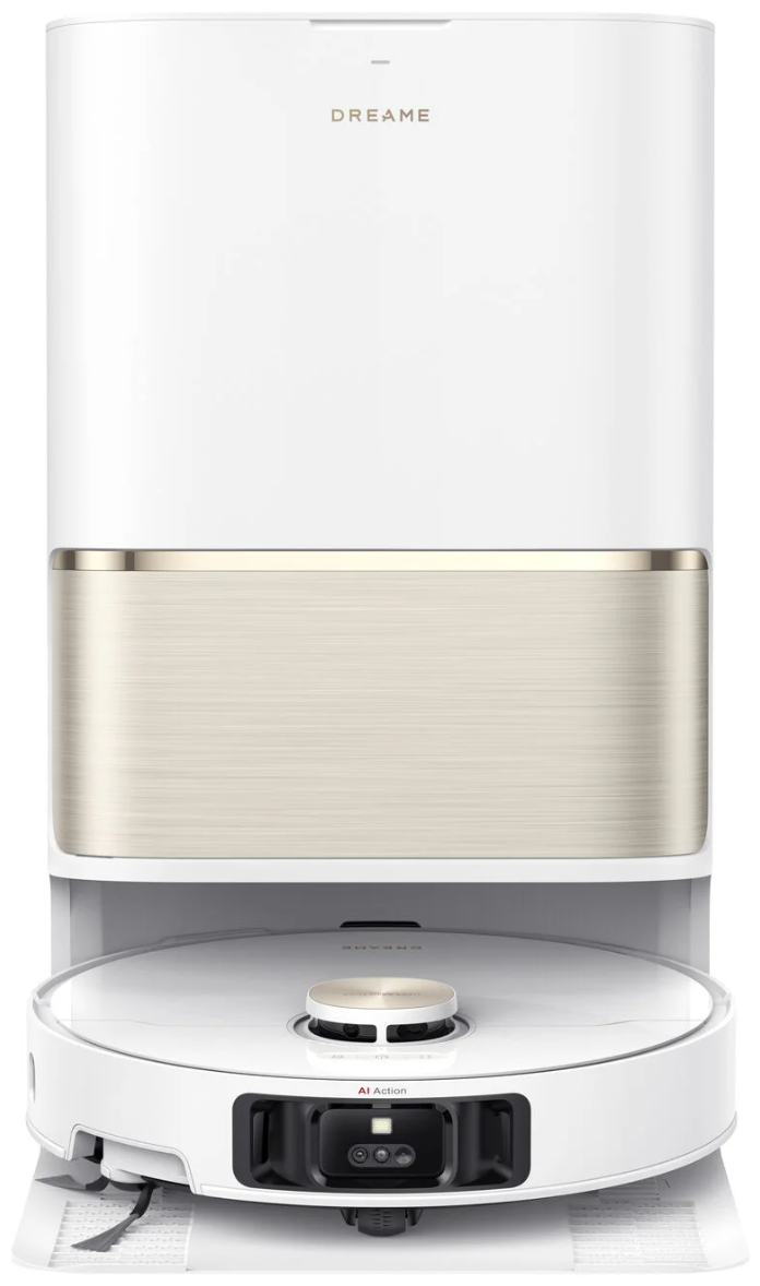 Dreame L50 Ultra сочетает мощную сухую и влажную уборку с интеллектуальной навигацией. Белый корпус с золотистыми акцентами подчеркивает премиальный стиль устройства.