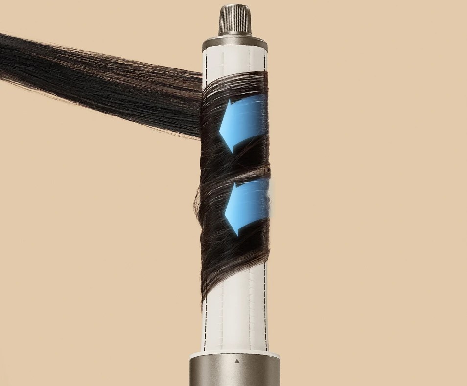 Насадка для завивки направляет воздух изнутри наружу, оставляя зазор для бережной укладки волос. Благодаря удобным настройкам и автоматическому наматыванию она позволяет без труда создать упругие локоны.
